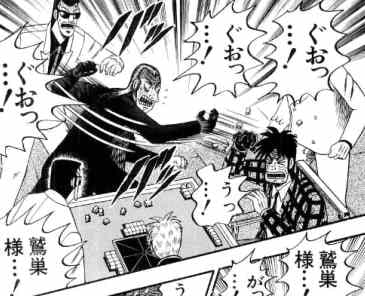 카이지와 사장이 17보를 내던지고 씨름하기 시작하는 장면