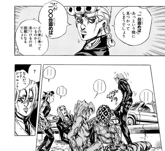 죠르노의 「차를 많이 훔치면 발견되기까지의 시간을 벌 수 있다」 라는 이론을 개인적으로는 잘 이해하지 못하겠다.