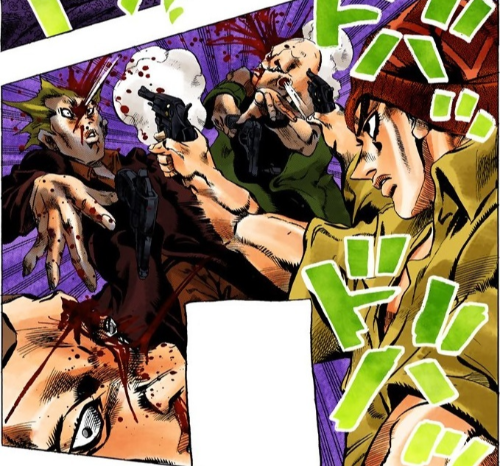 무의식중에 피스톨즈(가 각성하기 전의 원형과도 같은 스탠드)가 발동해서 날아온 총알을 모두 되받아쳤다
