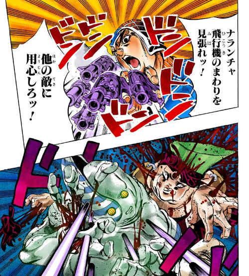 스탠드 유저라도 본체가 총에 맞으면 대개는 죽는다... 라는 점을 생각하면, 「총으로 쏴 죽이는 것을 서포트하는 능력」이라는 것은 살의를 담음에 있어서 전혀 낭비되는 구석이 없지.