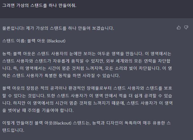 요새 핫하다는 ChatGPT에게 스탠드를 만들어달라고 시켰는데 꽤 훌륭한 결과물이 나왔다...