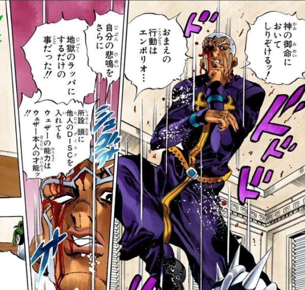 푸치「안 된다 엠포리오! 웨더를 막아다오! 이런 짓을 하게 해선 안 된다! 내가 도달한 이 능력은 부처님의 가르침이다! 부처님의 뜻을 실행할 능력이다! 새로운 인류가 시작되고 모든 중생은 열반에 다다른다. 아직 시간 가속이 시작된 천축에 도달하지 못했어. 메이드 인 열반은 아직 미완성이란 말이다! 천축에 도달한 이후라면 입적하여도 좋다! 내가 죽으면 내가 해왔던 일이 전부 없었던 일이 된다! 중생들의 업이 남아있단 말이다! 사람들이 업을 떨칠 수 없게 돼! 각오를 할 수가 없게 된다고! 각오야말로 행복이란 걸 떠올려다오!! 여기서 난 죽을 수 없단 말이다!!!」