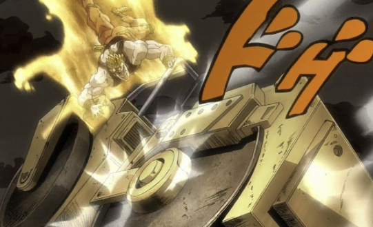 죠타로 등장, 도발한 후 DIO에게 킥을 날린다. 시간정지 종료, 로드롤러는 이번에야말로 지면에 떨어진다.