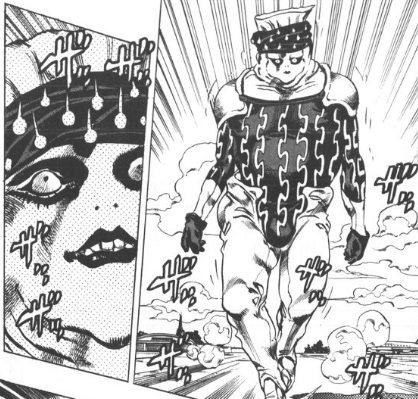 개인적인 추측이지만, 공격받으면서도 엄청난 각오로 돌진을 멈추지 않은 것은 아마도 정신조작계의 스탠드나 따위에게 조종당하고 있었던 게 아닐까 라고 생각하고 있어.