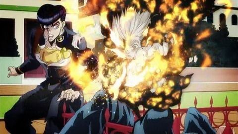키라 「누른다!」→ 에코즈 쓰리 프리즈 → 스타 플라티나 더 월드 → 죠타로「코이치 군, 너는 정말로 믿음직한 녀석이야... 이 마을에 와서 너를 만날 수 있어서 정말 다행이라고 생각해」→ 오라오라 → 끝