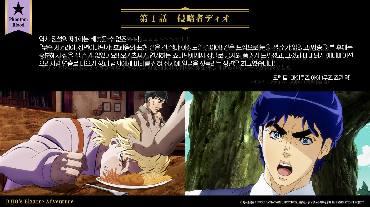 [파이루즈 아이가 뽑은 죠죠 애니메이션 추천 에피소드!!] 쿠죠 죠린 역의 파이루즈 아이가 각 시리즈의 스페셜 에피소드를 소개합니다. 이번 주는 팬텀 블러드부터 소개. 매주 2편씩 갱신합니다!! #jojo_anime