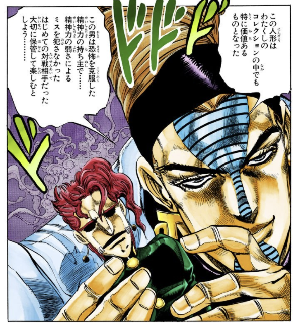 DIO의 명령이기 이전에 골수 도박꾼이기 때문에 승부하러 왔다는 것 같은 대사도 있었으니까.