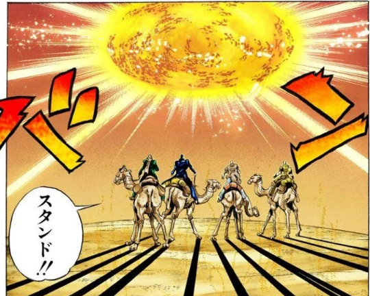 태양의 스탠드는 태양을 쏙 빼닮았을 뿐인, 주위를 낮처럼 만드는 능력을 가진 단순한 열에너지 스탠드일 뿐이라고 생각함.