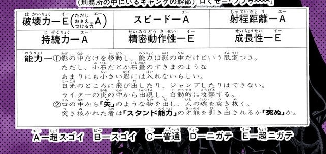 성능이 저정도인데 심지어 스탠드 쓰러뜨려도 본체는 손상 없이 멀쩡한건 꽤 열받는 스탠드군...